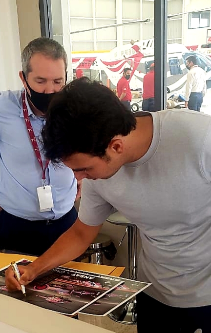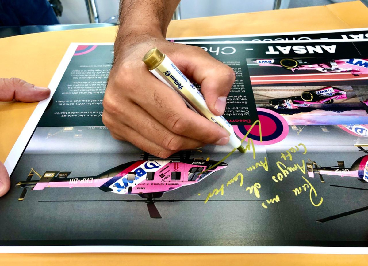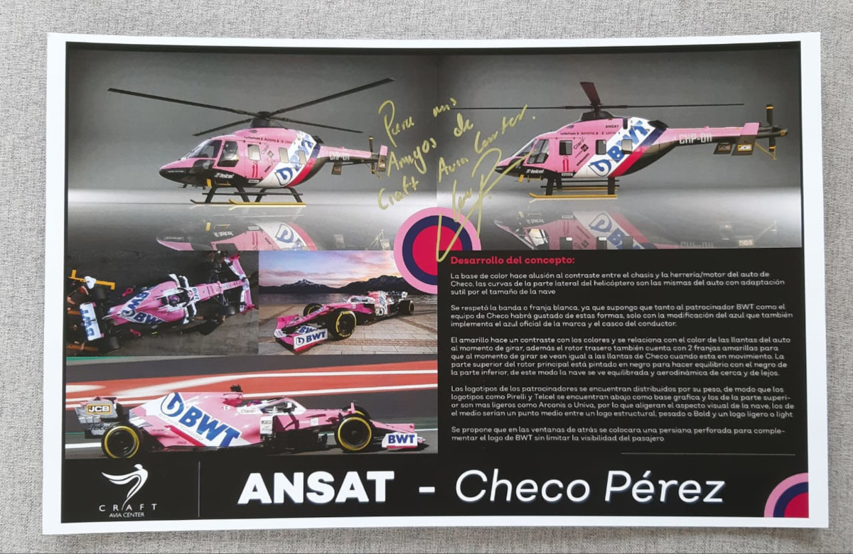 Ливрея вертолета «ANSAT – Checo Perez» повторяет схему окраски и размещения спонсорских логотипов на болидах гоночной команды BWT Racing Point F1 Team, за которую последние два года выступает Серхио Перес.